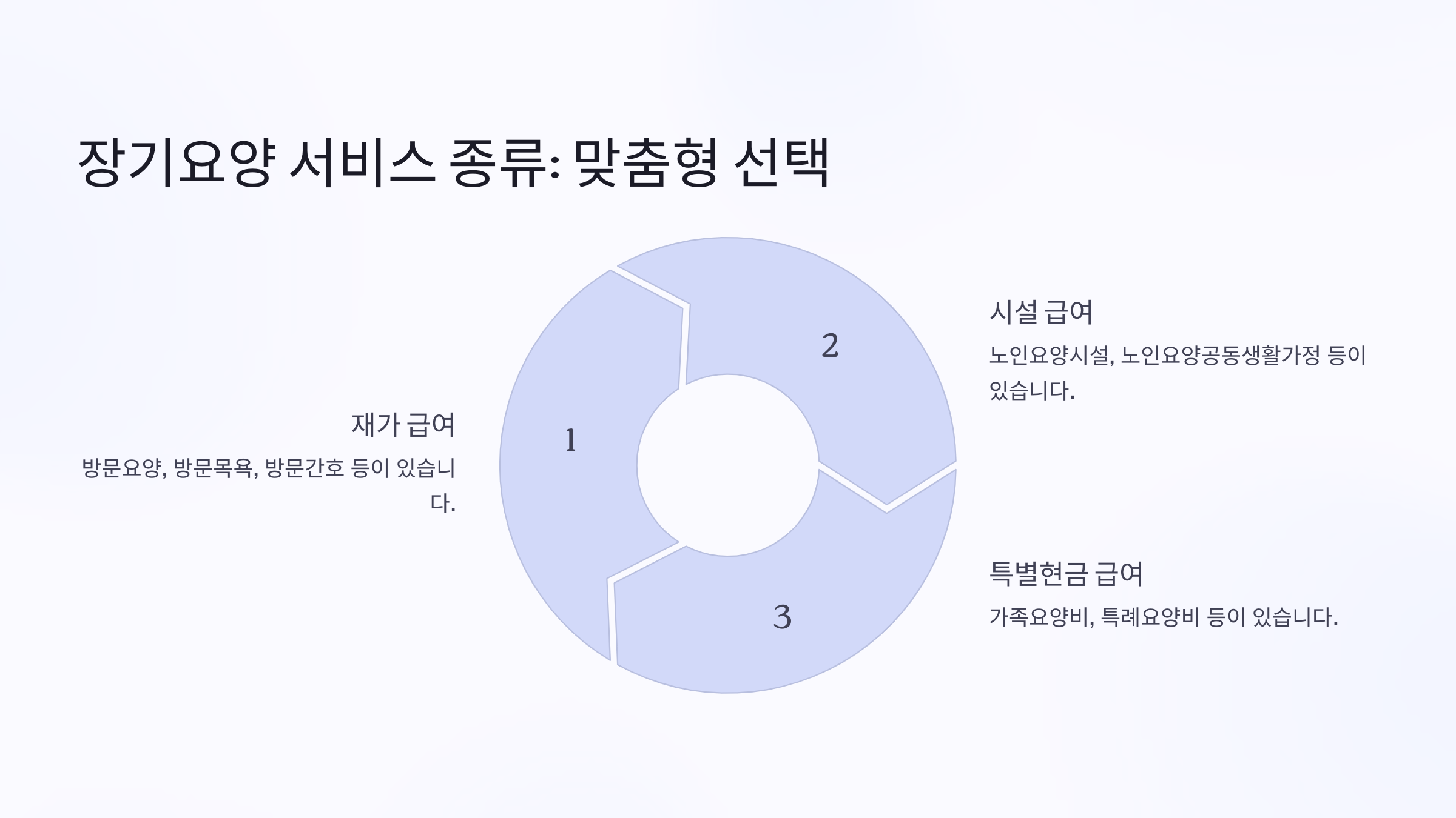 노인장기요양보험을 통해 제공되는 서비스는 크게 재가 서비스, 시설 서비스, 특별 현금급여로 나뉘어요. 신청자의 등급과 건강 상태에 따라 받을 수 있는 서비스가 달라진답니다. 😊