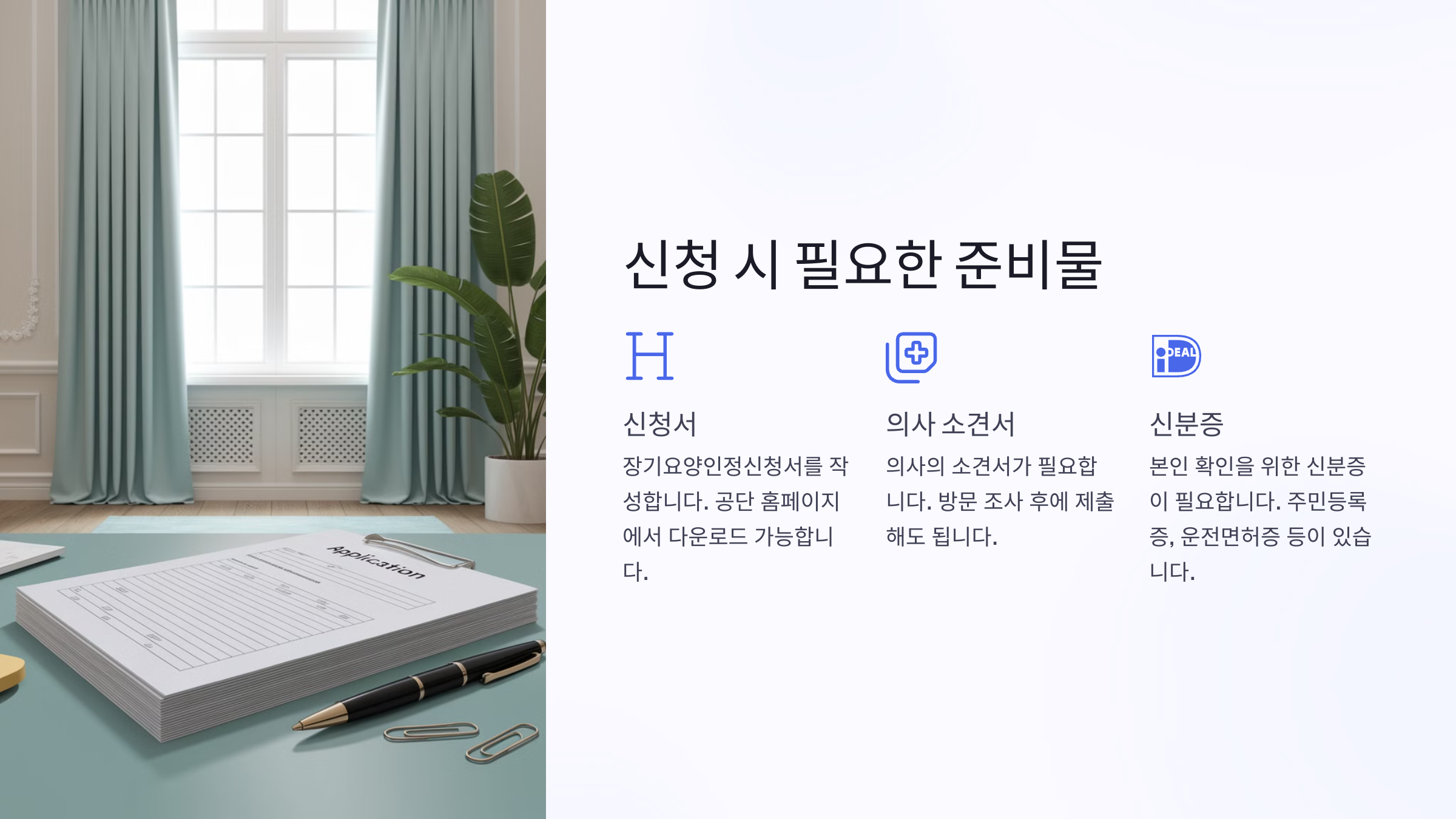 | 기본 서류 | 장기요양인정 신청서, 신분증 사본 |