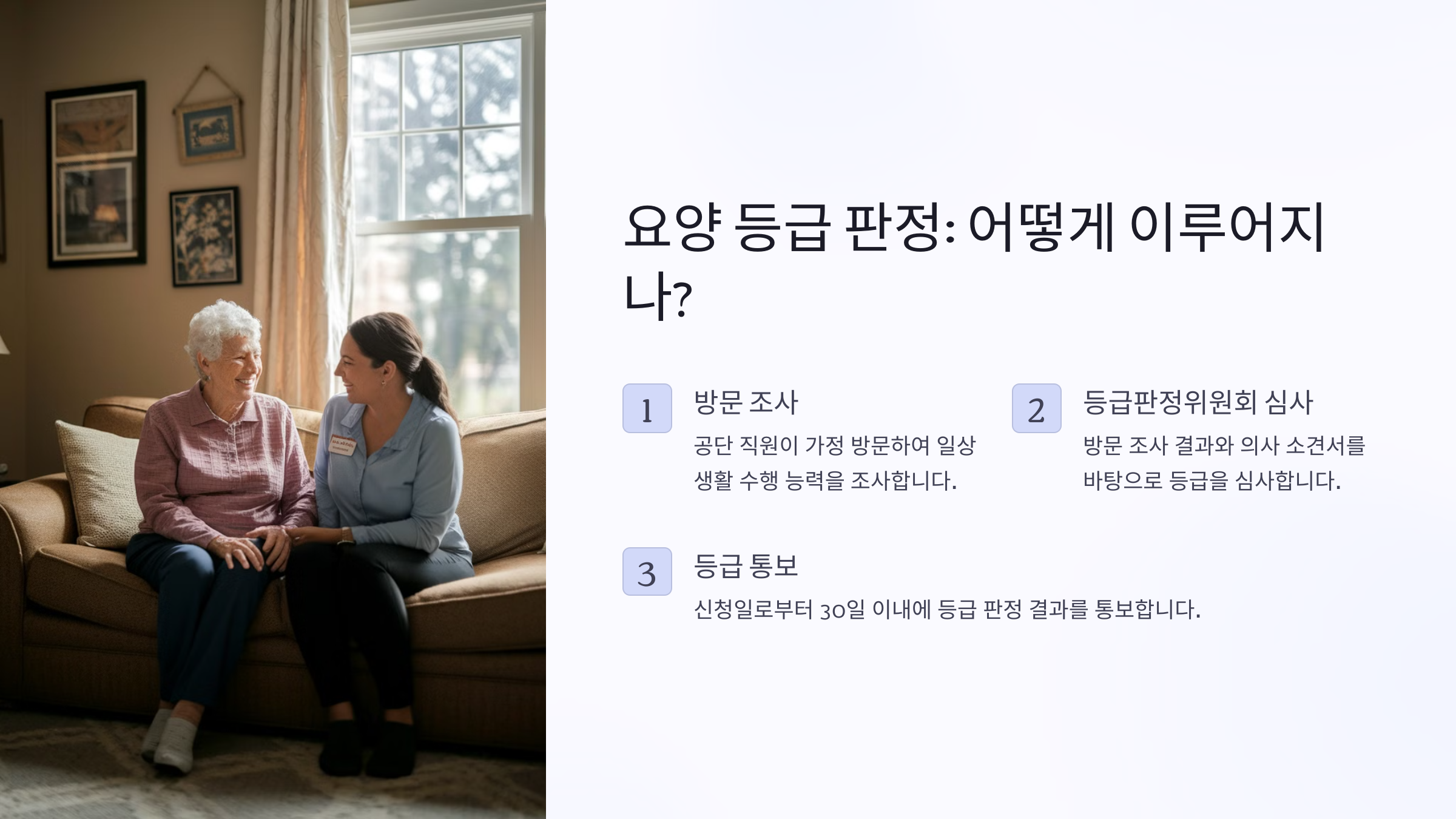 A2. 신청 후 공단 직원의 방문조사를 거쳐 평균 30일 이내에 등급 판정 결과가 나오게 돼요.