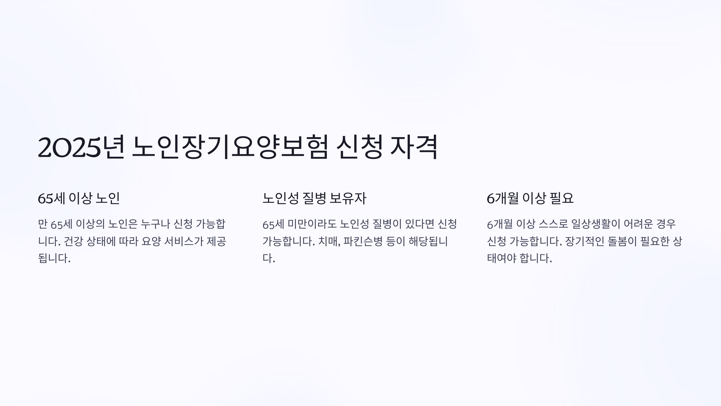 이처럼 노인장기요양보험은 어르신들의 삶의 질을 높이기 위해 꼭 필요한 제도예요. 그렇다면 2025년 신청 대상과 조건은 어떻게 될까요? 📌